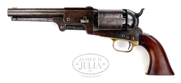 MARTIALLY MARKED COLT THIRD MODEL DRAGOON PERCUSSION REVOLVER. SN 17160. Cal. 44. Late third model with 7-1/2″ oct to rnd bbl, German silver front sight and 3-leaf sight dovetailed at back end of top flat. It has 4-screw grip frame, cut for stock with extended stock screws and has a tiny “US” beneath “COLT’S PATENT”. It has brass trigger guard with iron backstrap and 1-pc walnut grip with partially legible cartouches. There are small inspector marks on various parts. These fine revolvers saw service from date of issue through Civil War and afterward on frontier during the great expansion westward. CONDITION: Very good to fine, all matching including wedge. Bbl retains a mottled silver/brown patina with traces of case colors on rammer pivot. Cylinder is a gray/brown patina and retains about 25% Ranger-Indian fight scene. Four of six safety pins are prominent. Frame retains traces of case colors, being mostly a smooth brown patina. Trigger guard is a light mustard patina and backstrap is a mottled silver/brown patina. Grip is outstanding showing light wear with traces of finish having survived a cleaning. Mechanics are fine, strong bore with moderate pitting. 4-33333 JR346 (10,000-15,000)