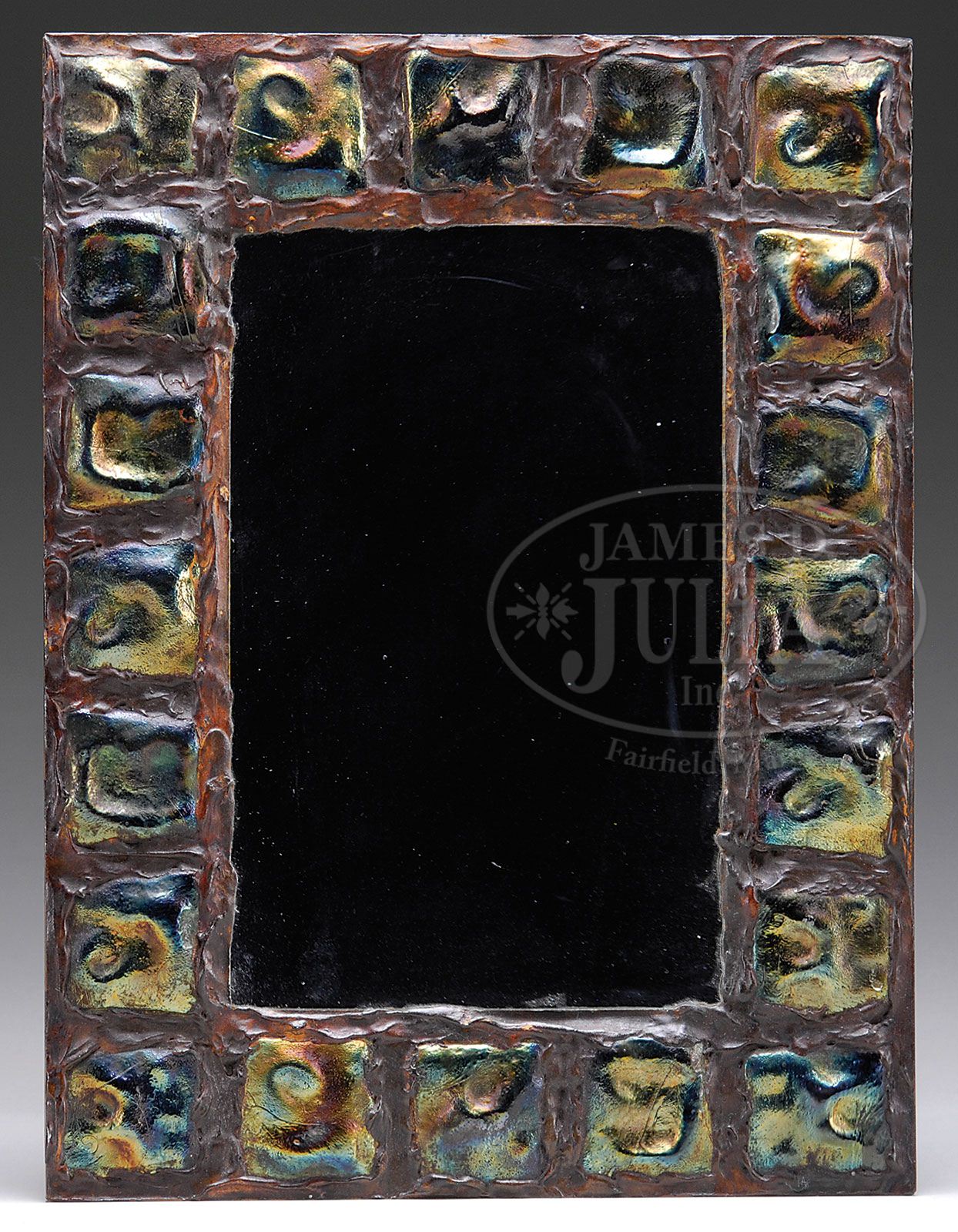 TURTLEBACK TILE MIRROR. Tiffany style turtlebacks are inset in a metal frame which surrounds a mirror. Signed with a spurious “Tiffany Studios New York 1771″ signature. SIZE: 12″ w x 16” t. CONDITION: Very good to excellent. 5-65524 (500-700)
