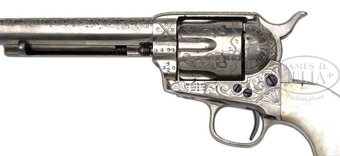 SCARCE NEW YORK STYLE ENGRAVED COLT SINGLE ACTION ARMY REVOLVER. SN 73248. Cal. 45 Colt. Nickel finish with 7-1/2″ bbl, full front sight and 1-line block letter address. Left side of frame has 3-line patent dates and caliber is marked on left front web of trigger guard. Mounted with 2-pc smooth pearl grips. Revolver is engraved, in New York style with about 80% coverage fine foliate arabesque patterns with very fine shaded background. Recoil shield & loading gate are engraved in fan patterns with a large zig zag & dot pattern on left side by hammer slot. Top strap is engraved in zig zag & leaf patterns with unusual zig zag engraved foliate arabesque & dot patterns extending about 2/3 the way up the bbl. Cyl is engraved to match the frame and backstrap is engraved in geometric patterns with a sparse fan pattern at the top. Ejector housing is engraved with a snake & dot pattern in top radius with a leaf & vine pattern on outer radius. Screws & trigger are fire blued. Grip frame is for a 1-pc grip, never having been fitted for a 2-pc grip locator pin. Accompanied by a Colt factory letter identifying this revolver in caliber 45 Colt with bbl length & type of stocks not listed, finished soft and shipped to Hartley & Graham, New York, NY, on Oct. 12, 1881 in a shipment of 25 same type guns. Under remarks the letter states that the word “soft” indicates that this revolver was shipped without final finishing for engraving outside the factory. CONDITION: Very fine. Overall retains 94-96% strong orig nickel with some slight losses around muzzle and some flaking on cyl. Nickel on bbl, top strap & grip frame has turned a little milky from handling; screws retain about all of their orig fire blue. Grips have a chipped left toe and left heel with a minor chip on rear edge of right side and retain great fire & color. Hammer will not catch in safety or half cock notches, otherwise mechanics are fine, strong bright bore with a few small spots of pitting. 4-46064 JR195 (20,000-30,000)