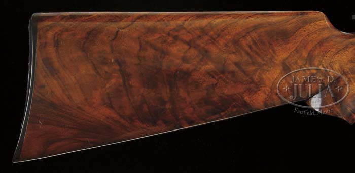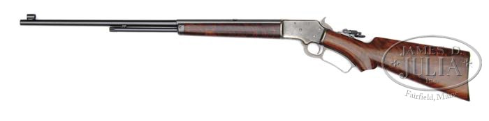 *SPECIAL ORDER MARLIN MODEL 1897 TAKEDOWN RIFLE. SN 401956. Cal .22 S,L,LR. 24″ part rnd bbl. Bbl is marked “Marlin firearms co. NEW-HAVEN CT. U.S.A./PAT’D NOV. 19.1878. APRIL 2.1889. AUG.12.1890. MAR. 1.1892.” Top tang is marked “Marlin/MODEL ’97” Lyman No. 17 target front sight, Lyman combination tang sight and Redfield filler in the rear sight dovetail. This is a last variation model 1897/97 rifle with 1907 type ejector and assembly screws in the left side of the frame. Select walnut stock and forend with exceptional grain and brilliant orange contrasting tones. 2nd type Marlin hard rubber buttplate. PROVENANCE: George F Peters Collection. CONDITION: Fine. 95% bbl and magazine tube blue. 70% case colors blending with patina in the heavy wear areas. Sound stock and forend with very good orig. fine finish showing light scratches and handling marks. Crisp mechanics. Bright bore with sharp rifling. 4-41780 DS9 (2,500-3,500)