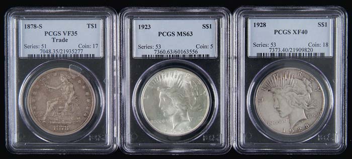 THREE GRADED CASED SILVER DOLLARS. Graded by PCGS. 1878-S (VF35) Trade Dollar; 1923 (MS63) Peace Dollar and 1928 (XF40) Peace Dollar. 9-72137-15 (400-800)