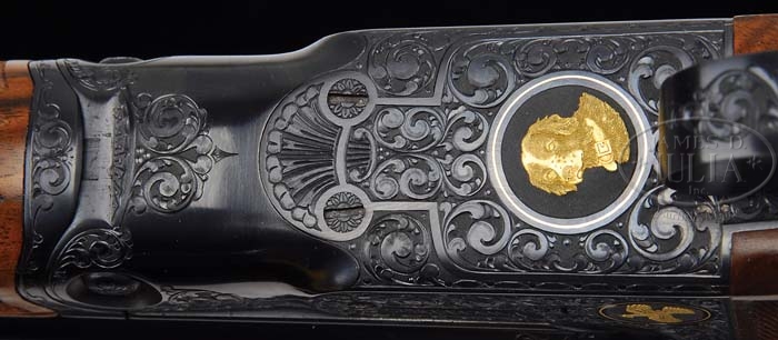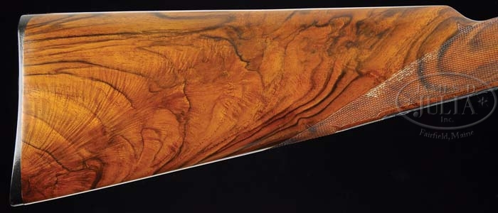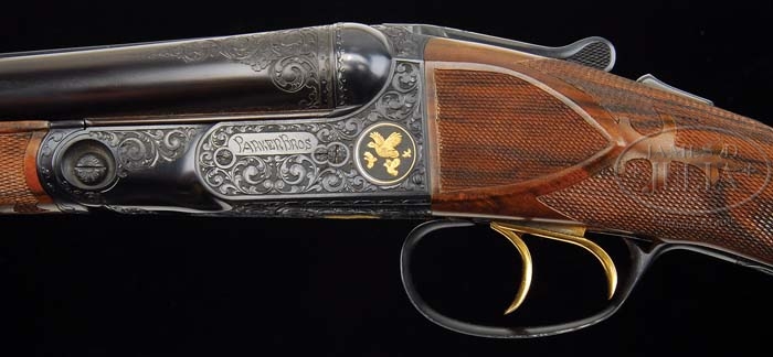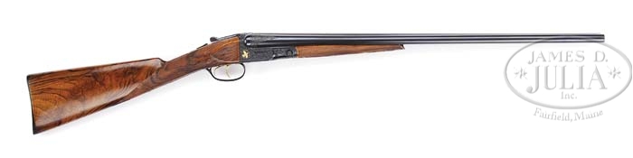*BEAUTIFUL CUSTOM PARKER SIDE BY SIDE SHOTGUN. SN 206159. Cal. 20 ga. 26″ bbls with matted tapered concave rib, sgl silver sighting bead, 2-3/4″ chambers, IMP-MOD chokes, extractors, and dbl triggers. Top rib of bbl is marked “PARKER BROS. MAKERS.MERIDEN.CT.U.S.A.VULCAN STEEL”. Breach end have 2″ wedge of foliate scroll engraving. The “O” size receiver is beautifully engraved with open foliate scroll and shaded backgrounds, Parker Bros. on each side and left side with gold circle with 4 gold quail in flight with matte background. Trigger plate has gold circle with gold Spaniel head with matte background and right side has gold circle with gold grouse in flight with matte background. Mounted with marble figured walnut, checkered side panels, fancy fleur-de-lis straight grip, Parker hard rubber dogs dead buttplate, fancy fleu-de-lis checkered splinter forend. Bore diameter: left -.619, right -.620. Bore restrictions: left -.014, right -.005. Wall thickness: left -.035, right -.040. Drop at heel: 3″, drop at comb: 1-3/4″. Weight: 6lbs. 3oz. LOP 15″. Consignor reports that this fine work was done by “Robert Cane”. CONDITION: Extremely fine. Bbls retain virtually all of their fine custom blue finish with just a few very minor light handling marks. Receiver retains virtually all of its fine custom blue finish. Stock is sound with crisp checkering a few minor handling marks and retains virtually all of its fine custom hand rubbed oil finish. Forend is sound with sharp checkering, a few minor light handling marks and retains virtually all of its fine custom hand rubbed oil finish. Mechanics are crisp with non-auto-safety and nice shiny bores. 4-38795 BDT66 (7,000-10,000)