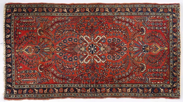 FOUR SAROUK MATS. Circa 1920. The first, soft rust field with open floral sprays surrounded by a medium blue border. The second, a rose field with elaborate tan and blue floral sprays, a simple dark blue floral border. The third, a rose field with predominantly ivory floral sprays. The fourth, brick red field, open floral sprays, a simple medium blue border. SIZE: The first, 4 ft 7 in x 2 ft 3 in. The second, 4 ft x 2 ft 2 in. The third, 2 ft 5 in x 1 ft 10 in. The fourth, 3 ft 11 in x 2 ft. CONDITION: The first, missing at the ends, edge wear, good pile. The second, missing the ends, edge wear. The third, good condition. The fourth, missing at the ends, edge damage, good pile. 9-91664 (500-700)