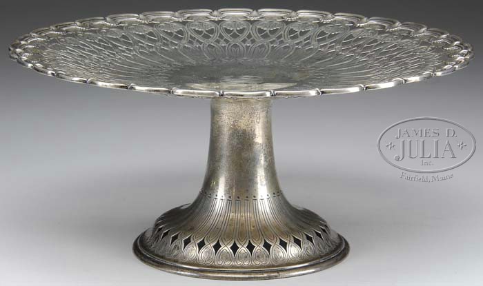 OUTSTANDING TIFFANY & CO. STERLING SILVER DECORATED RETICULATED CAKE STAND. The top reticulated plate having a shaped edge decorated with scallop shells, floral loops surrounding a central monogram. A tapered stand with similar floral loops having piercing. Base marked “Tiffany & Co. 16976 Makers 9581 Sterling Silver 925/1000 M” (John C. Moore 1907-1947). Mark #23 in “Tiffany Silver” by Carpenter. WEIGHT: 38.5 tr. oz. SIZE: 5-3/4″ h x 12-1/2″ dia. CONDITION: Very good. 5-64350 (2,500-3,500)