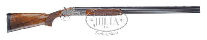 *FABULOUS FABBRI MAJESTIC GRADE COMPETITION AND GAME GUN W/CASE. SN E583. Cal. 12 ga. 32″ bbl hand filed vent rib with single ivory sighting bead, 3″ chambers, IMP-MOD/IMP-MOD choke, single trigger and ejectors. Date code “AE” indicates 1979 manufacture. Right side of bbls marked “BOEHLER SUPER BLITZ STEEL” and left side “IVO FABBRI-BRESCIA ITALY”. Sidelock frame is relief engraved in a flower and floral vine scroll spewing from a mythical lion-like animal on each sideplate with fine vine and flower pattern on bottom and two semi-nude female angels. All of this is done with a black shaded background. Trigger plate is signed “INC C. TOMASONI”. Mounted with a select streaky walnut with fine checkered pistol grip, a 1″ ebony checkered buttplate with engraved heel and toe plates. Blank gold initial shield, checkered fluted field style forend with engraved metal tip insert, engraved teardrop shaped escutcheons. Bore diameter: top .724, bottom .724. Bore restrictions: top .025, bottom .025. Wall thickness: top .035, bottom .035. Drop at heel: 1-1/4″, drop at comb: 1-1/8″. Weight: 8lbs. 8oz. LOP 14-3/4″. Accompanied with oak and leather case and access. with brown canvas cover with leather corners. CONDITION: Extremely fine. Bbl retains 99% of its fine blue, receiver is a fine silver color with black background. Stock is sound with sharp checkering, a few minor handling marks and virtually all of its fine hand rubbed finish. Forend is sound with fine, crisp checkering, a couple minor handling marks and virtually all of its fine hand rubbed finish. Mechanics are crisp with non-automatic safety. Strong ejectors and bright shiny bores. Case and cover are equally new with a few minor scuffs. 4-35880 BDT209 (50,000-70,000)