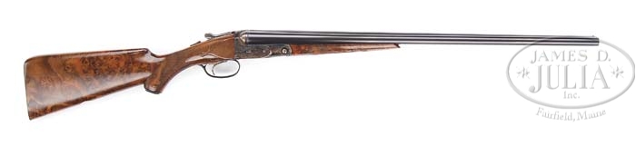 *PARKER REPRODUCTION DHE GRADE SIDE-BY-SIDE SHOTGUN. SN 20-04551. Cal. 20 ga. 26″ bbls with matted tapered concave rib, sgl brass sighting bead, 2-3/4″ chambers, IMP.CYL/MOD, ejectors and sgl selective trigger. Left bbl is marked “Parker Reproduction by Winchester – 20 gauge 2-3/4″ / East Alton IL. U.S.A.” O size receiver is engraved in the Parker D-grade style with pointing setter on left side, 3 pheasants on trigger plate, Parker across center of bottom and a pointer on point on right side. Remainder of engraving is an open foliate scroll. Mounted with burl figured walnut, side panel with dropper points, checkered pistol grip with hard rubber grip cap marked “Parker by Winchester”, checkered butt with skeleton butt plate, blank gold initial oval and checkered splintered forearm. Bore diameter: left -.619, right – .618. Bore restrictions: left – .016, right – .010. Wall thickness: left – .039, right – .042. Drop at heel: 2-5/16, drop at comb: 1-3/8. Weight: 6 lbs. 9 oz. LOP 14-1/4″. Accompanied with Parker reproduction luggage case with tan canvas cover and leather corners, green felt interior, Parker Reproduction label on inside lid, and Parker Reproduction nickel snap caps. CONDITION: Extremely fine, as new. Bbls retain virtually all of their orig blue with a couple of very minor tiny handling marks. Receiver retains virtually all of its orig case colored finish, stock is sound with crisp checkering, a couple of minor scratches on right side between the tangs and a few minor handling marks and retains virtually all of its orig finish. Forend is sound with crisp checkering and only a couple tiny handling marks and retains virtually all its orig finish. Mechanics are crisp with automatic safety, strong ejectors and shiny new bores as gun appears to be test fired only. Case and canvas cover are in equally new condition. 4-38083 BDT28 (3,000-4,000)