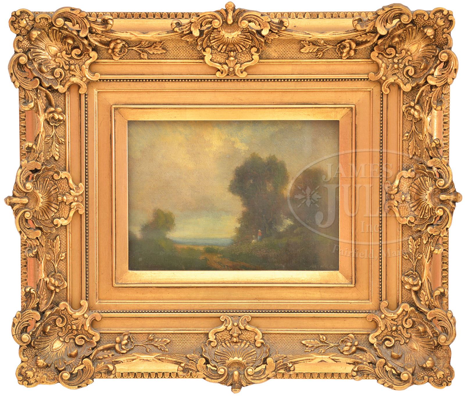 ROBERT CRANNELL MINOR (American, 1840-1904) BARBAZON STYLE LANDSCAPE. Oil on wood panel Housed in its original gold gilt fancy frame with gilt liner behind glass Signed lower right “Minor” SIZE: 6″ x 8″. Overall: 13-1/2″ x 15-1/2″. CONDITION: Very good. 9-29387 (1,500-2,500)