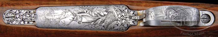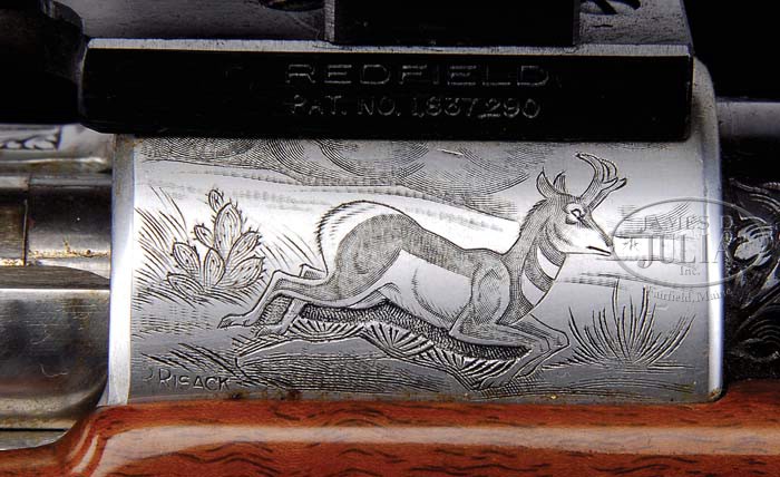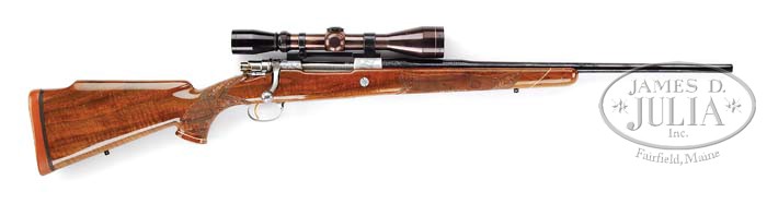 *BROWNING OLYMPIAN GRADE SPORTING RIFLE WITH SCOPE. SN 1X7384. Cal. .270. 22-1/2″ Round bbl is stamped “Browning Arms Company St. Louis MO. & Montreal P. Q.” on left rear. Right rear is stamped “. Caliber . 270 Only”, SN, and “Made in Belgium” with Belgian proofs. Bbl has relief open scroll and acanthus with stippled background engraving adjacent to action. Satin chrome plated FN Model 98 action has safety at right side behind bolt handle. Action has nearly full coverage of open acanthus and scroll engraving on left rail and bridge. Receiver ring shows game scene of prong horn running through desert background on right side, and bugling elk in wooded background on left. Both of these vignettes have engravers signature “R. Risack”. Bright polished bolt has engine turning on extractor. Bottom metal has hinged floorplate with release pivoting at front of bow, with portrait of mule deer with large tree in background, and twigs, grass, vines and ferns in foreground. Engravers signature “M. Macis?” is in foreground. A charging bear is on trigger guard bow. Nicely fiddle figured Claro walnut full flared pistol grip stock measures 13-3/4″ over Silvers type pad, and features large roll over right hand cheekpiece, rosewood grip cap and forend tip with white line spacers. Grip cap has inlaid vacant gold diamond. Grip area and forend of this well crafted rifle have very fine checkering, approx 30 LPI with acanthus carved surround, and stippling out to borders. Stock also features sling eyes and engraved recoil bolt. Leupold 3 X 9 Vari-X II scope with crosshair reticle is in older Redfield rings in Redfield one piece base. Drop at heel: approx 2-3/4″, drop at comb: Approx 2-1/4″. Weight: 8 lbs. 15.7 oz,with scope. LOP 13-3/4″. CONDITION: Excellent. Bbl retains virtually all of its blue. Receiver and floorplates retain all of their coin finish, bolt nearly all of its bright polish, darkening slightly on handle. Stock retains nearly all of its high gloss varnish finish, with some areas of crazing, and a few chips in finish from handling and use. Stock seems to have faded a bit over the years with rosewood turning almost blond. Bore is excellent. Scope anodizing has faded. Optics are clear. A fine early example of these sought after rifles. 4-39488 MGM68 (3,000-5,000)