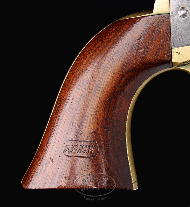 MARTIALLY MARKED COLT MODEL 1851 NAVY ARMY REVOLVER. SN 56171. Cal. 36. Fine 3rd model martial ’51 with 7-1/2″ oct bbl, brass cone front sight and 1-line “NEW YORK CITY” address with dashes. It has usual Ormsby naval battle scene on cylinder & “COLT’S PATENT” over a tiny “U.S.” on left side of frame. It has brass grip frame with 1-pc walnut grip having a legible “LCA” cartouche in an oval on left side (the only “LCA” inspector this cataloger could discover was for Lucius C. Allin who was a Colt Dragoon inspector) and an “RHKW” cartouche in an oval on right side for Capt. Robert Henry Kirkwood Whitley. Various parts have small “A” inspector initials (indicating O.W. Ainsworth sub-inspector) including backstrap at top, grip at bottom left side and top of left side, upside down on right shoulder of trigger guard, on bbl lug & cylinder. All six safety pins on cylinder are prominent and cylinder has vice marks on opposite sides. CONDITION: Fine to very fine, all matching including wedge. Bbl retains a thin blue/brown patina but shows very little wear with a few scattered spots of fine pitting. Rammer pivot has some bright case colors with a spot of pitting on right side. Cylinder retains virtually all of a light restored finish, not having been polished with the aforementioned vice marks. It also retains about 60-70% crisp Ormsby naval battle scene. Frame retains 70-75% faded case colors turning silver with some light surface discoloration. Hammer retains about 50% faded case colors with light pitting around nose. Grip frame is crisp with a medium mustard patina. Grip is extremely fine showing very light wear with a few minor scratches & nicks and retains most of its orig varnish with a crisp cartouche on right side, somewhat thinner cartouche on left side, probably from a light strike. Mechanics are crisp, bright shiny bore with scattered light pitting. 4-31220 JR199 (7,000-11,000)