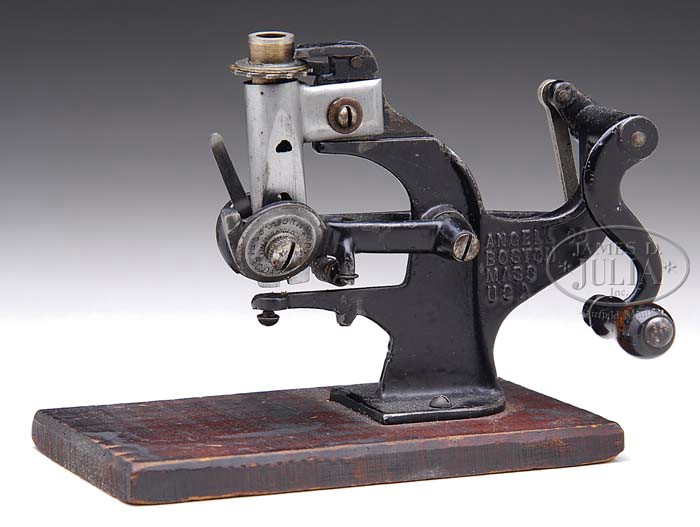 ANGELL PENCIL SHARPENER. Crank style pencil sharpener mounted to wood base that shaves pencil tips with two adjustable round blades and rotates the pencil via a ratchet mechanism. Cast iron body embossed “Angell Boston, Mass, USA” SIZE: 4-3/4″ h x 6-1/2″ l. PROVENANCE: Late John Woods Collection, St. Louis, MO. CONDITION: Very good plus with some chips to paint. 1-9344-7 (1,000-1,500) Auction: Advertising, Toy & Doll - Spring 2009 Please Note: All prices include the hammer price plus the buyer’s premium, which is paid by the buyer as part of the purchase price. The prices noted here after the auction are considered unofficial and do not become official until after the 46th day. |