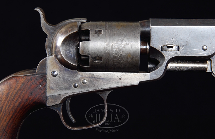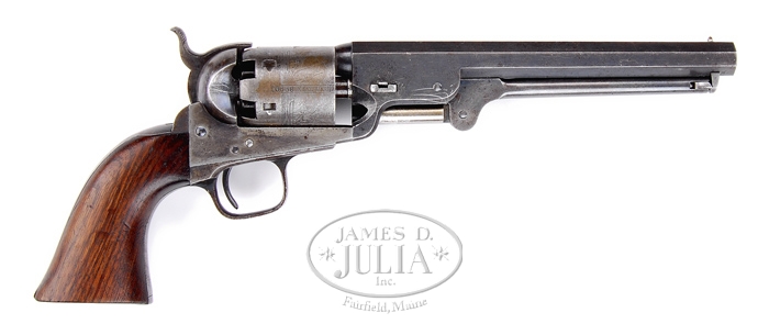 MARTIALLY MARKED COLT MODEL 1851 BLACK NAVY NAVY REVOLVER. SN 89901. Cal. 36. Fine Navy Navy with 7-1/2″ oct bbl, brass cone front sight that appears to have been soldered in place and Hartford address. It has usual straight cylinder with Naval battle scene and 3-screw frame, not cut for shoulder stock and a tiny “U.S.” beneath “COLT’S PATENT” on left side. It has large iron trigger guard & back strap with 1-pc walnut grip. Buttstrap is stamped “USN” with stars and left side of bottom of grip is stamped “I / GWR” with stars, for Commander George W. Rogers. CONDITION: Very fine to extremely fine, all matching including wedge & rammer, grip was not checked. Bbl retains about 90% orig blue, slightly thinned. Rammer pivot retains most of its lightly faded case colors. Cylinder is flaked to a light gray patina and retains 93-95% Ormsby Naval battle scene. Five of six safety pins on back are prominent. Frame retains 60-70% faded case colors, stronger on right side and hammer about 80% bright case colors, faded to gray on top. Trigger guard & backstrap are mostly a gray patina with blue in sheltered areas. Grip is crisp & sound with light wear and retains most of its orig oil finish. Mechanics are crisp, bright shiny bore with scattered pitting. 4-33314 JR366 (17,500-25,000)