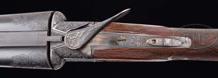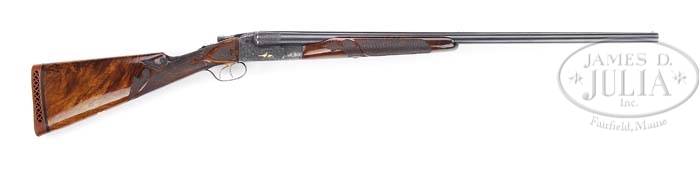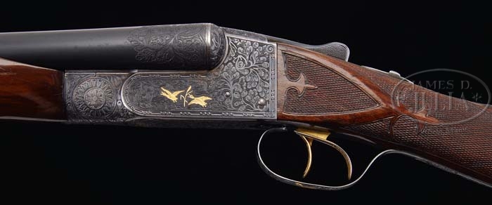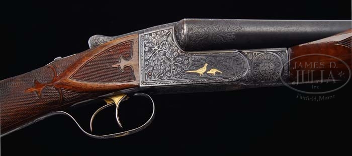 *RARE ITHACA FLUES MODEL GRADE 7 SIDE-BY-SIDE SHOTGUN. SN 376136-7. Cal. 16 ga. 28″ bbls with matted tapered rib with ivory front and silver center sighting bead, 2-3/4″ chambers, choke marked 4 and 4, ejectors and double triggers. Top of right bbl is marked “Ithaca Gun Co.” and left “Ithaca, N.Y.U.S.A.” Each bbl has engraving wedge of oak leaf and acorn about 1-1/2″. The grade 7 receiver is engraved with a oak leaf and acorn pattern with finely stippled background, 2 gold ducks taking flight and single gold cattail on left side, two-color gold eagle clutching arrows on bottom, 2 gold pheasants on right side, mark above eagle “Made in USA” and gold bust of elk on triggerbow. Mounted with highly figured walnut, fleur de lis checkered side panels, fleur de lis checkered straight grip with ribbons, red vented Pachmayr pad, gold initial shield engraved with a large “E”, fleur de lis checkered beavertail forend with ribbons and triangular ebony tip insert. Bore diameter: left – .662, right – .663. Bore restrictions: left – .022, right – .015. Wall thickness: left – .042, right – .042. Drop at heel: 2-1/2″, drop at comb: 1-1/4″. Weight: 7 lbs. 8 oz. LOP 14-1/2″. CONDITION: Very fine, bbls retain 95% orig blue with some minor muzzle wear, usual minor nicks and dings, faint rub mark from forend and some very fine surface spotting over right chamber area. Receiver retains much of its orig case hardening, slightly silvering across bottom. Stock is sound with slightly flat checkering, some minor nicks and dings and retains most of a fine professional restored oil finish. Forend is sound with slightly flat checkering, some minor nicks and dings and retains a professional restored finish. Mechanics are crisp with automatic safety, strong ejectors and nice shiny bores. 4-37587 BDT43 (17,500-27,500)