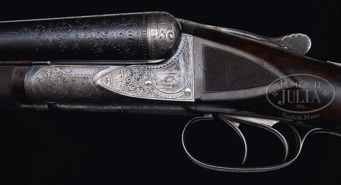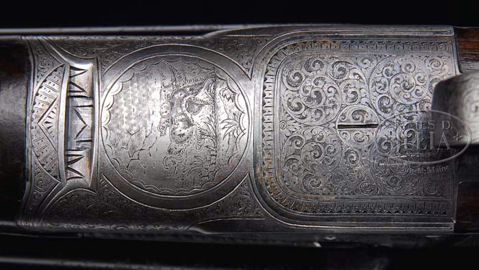 *SCARCE A. H. FOX DE GRADE SIDE-BY-SIDE SHOTGUN. SN 12172. Cal. 12 ga. 30″ Krupp Fluid Steel bbls with tapered, matted, concave rib with sgl brass sighting bead, 2-3/4″ chambers, MOD / FULL chokes, dbl triggers & ejectors. Bbl chambers areas have 3″ wedge of scroll engraving with right bbl marked “Krupp Fluid Steel Made By” and left “A. H. Fox Gun Co. Phila. PA.”. Rib has 1-1/2″ engraved area with blank in center. The fine D grade receiver has “Ansley H. Fox” in an arc, 2 feeding quail & foliate arabesque scroll on left side and similar with woodcock scene on right. Bottom of receiver is engraved with a circle & 2 pointing setters with balance of receiver & trigger guard in very tight foliate arabesque scroll. Mounted in nicely figured “streaky” walnut with checkered side panels, checkered rounded pistol grip & leather-face pad. Fully checkered splinter forend. Bore diameter: left -.725, right -.725. Bore restrictions: left -.032, right -.014. Wall thickness: left -.035, right -.038. Drop at heel: 2-1/2″, drop at comb: 1-1/4″. Weight: 7 lbs. 10 oz. LOP 14-1/4″. Accompanied by Roe S. Clark letter identifying gun as DE grade 12 ga. with 30″ bbls, choked MOD / FULL, fitted with recoil pad, pull of 14-1/4″, drop at comb 1-1/2″, drop at heel 2-1/2″; gun to weigh 7 lbs. 15 oz. Note on card states “Name in gold on rib” and “Henry Pataky”; gun was shipped to Goshorn, Sept. 15, 1909. Gun is accompanied by vintage leg-of-mutton case. PROVENANCE: The David Herrmann Collection. CONDITION: Fine. Bbls retain about 90% blue with some minor muzzle wear and a few minor nicks & scratches. Gold name on rib has been removed & blackened in. Receiver retains 65-70% visible color with balance across bottom & sharp edges a silvery patina. Trigger guard has traces of orig blue, but mostly a silver patina color. Stock is sound with minor chip behind top tang and a few light nicks, dings & handling marks. Stock has light coat of wiped-on finish that is worn to a hand patina through grip area. Nearly fully checkered forend has only a couple minor bruises & slightly worn checkering. Gun is tight, mechanics are crisp, with strong ejectors & shiny bores. 4-35249 BDT24 (9,500-12,500)