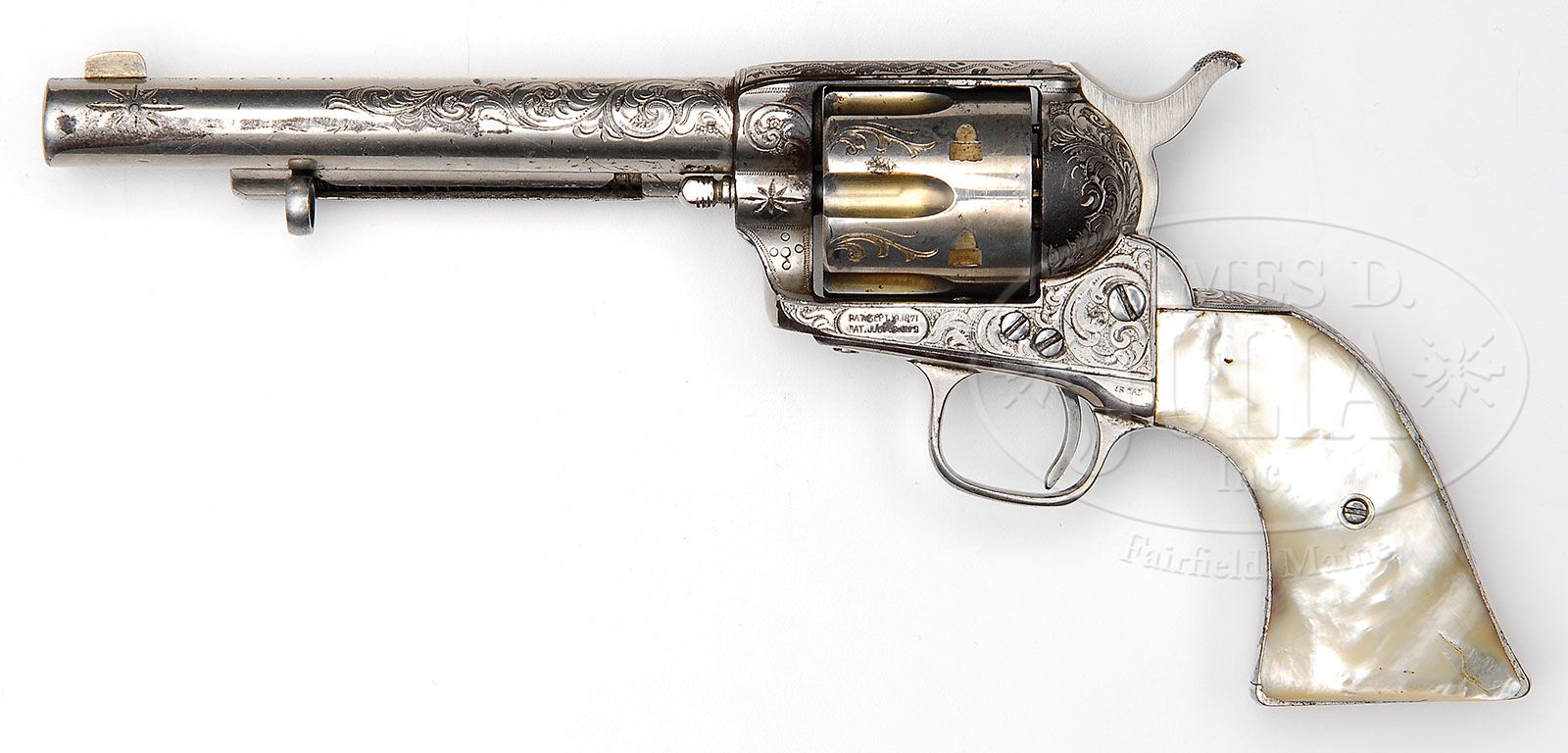 Please Note: Estimate should be $7,000-10,000 ENGRAVED COLT SINGLE ACTION ARMY REVOLVER. SN 33217. Cal. 45 Colt. Nickel finish with 6″ bbl, relocated German silver front sight and 1-line address. Left side of frame has 2-line patent dates and left shoulder of trigger guard has caliber marking. Mounted with smooth 2-pc pearl grips. Receiver is engraved, probably from the Nimschke shop with about 80% coverage foliate arabesque patterns on the frame with leaf & vine patterns on the top strap and hunter stars on each side of the front frame. Engraving extends up both sides of the bbl with stylized hunter stars on each side near the muzzle. Ejector housing is engraved with a snake & dot pattern in the top gullet with foliate arabesque & geometric patterns on the outer radius. Top of the back strap is engraved in a beautiful spade shaped fan pattern with geometric patterns down the back strap and on the trigger guard. Cyl is lightly engraved by another hand in foliate arabesque patterns on the lands between the flutes. Cyl & hammer are modern replacements. Cyl is lightly gold washed CONDITION: Good. Bbl, frame, trigger guard & back strap are matching numbered, cyl is unnumbered; bbl is cut as noted above; overall retains about 70-75% orig nickel on the frame, bbl & grip frame; cyl retains about 90% nickel with gold wash in the flutes and rear face. Grips have several chips but are basically sound showing heavy wear and good fire. Mechanics are fine, strong bore with frosty pitting. 4-48244 JR361 (7,000-10,000)