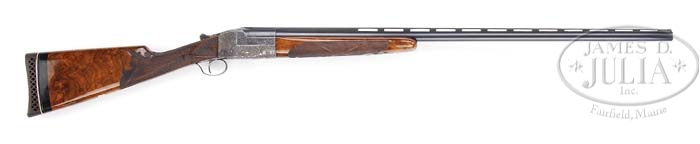 *EXTREMELY SCARCE ITHACA FLUES GRADE 7 SINGLE BARREL TRAP GUN. SN 270474-T. Cal. 12 ga. 34″ bbl with matted tapered vent rib, dual ivory sighting beads, 2-3/4″ chamber, FULL choke, ejector and sgl trigger. Flat sides of bbl chamber area and across the top are oak leaf and acorn engraved with a fine stippled background. A ribbon on left side is engraved “Ithaca Gun Co.” and on right side “Ithaca, N.Y.” The very elaborately engraved sgl bbl receiver is very detailed oak leaf and acorn pattern with stippled background, 2 gold ducks in flight and 2 gold cattails on left side, a gold eagle with shield and clutching arrows on bottom, and 2 gold pheasants on right side. Above gold eagle in ribbon is marked “Made in / U.S.A.” Triggerbow is engraved with oak leaf and acorn pattern and has a gold bust of an elk’s head. Mounted with extremely figured walnut, fluer de lis checkered side panels, fluer de lis checkered straight grip with ribbons, a 5/8″ ebony spacer, Pachmeyer vented trap pad, blank gold initial shield, checkered beavertail forend with fluer de lis, ribbons and triangular ebony tipped insert. Bore diameter: .728. Bore restrictions: .030. Wall thickness: .049. Drop at heel: 2-1/16″, drop at comb: 1-7/16″. Weight: 8 lbs. 9 oz. LOP 14-3/4″. CONDITION: Fine, bbl retains 90-95% orig blue with minor nicks and scrapes, some minor muzzle wear and a faint rub line caused by forend. Receiver is clean and shows case coloring in protected areas but is mostly a pleasing silver patina finish. Stock is sound with a nicely restored checkering, a few minor nicks and scratches and retains a fine hand rubbed, probably factory restored finish with some very fine crazing lines. Forend is sound with only a few minor nicks and scratches, restored checkering and retains most of a probably factory restored finish. Mechanics are crisp, made without safety, strong ejector and nice shiny bore. 4-37494 BDT41 (7,500-9,500)
