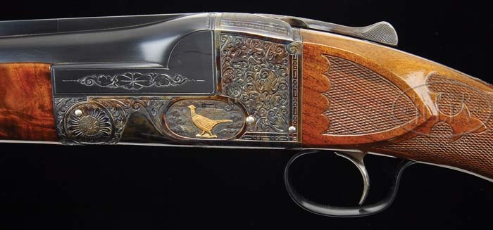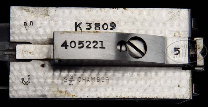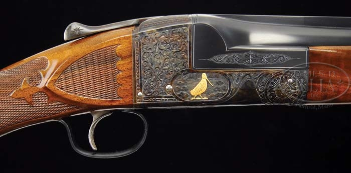 *FANTASTIC ITHACA 5E GRADE SINGLE BARREL TRAP GUN. SN 405221. Cal. 12 ga. 32″ bbl, matted tapered ventilated rib, Raybar front and ivory center sighting beads, 2-3/4″ chamber, FULL choke, ejector and sgl trigger. Flat sides of bbl engraved with sgl line border and foliate scroll. The grade 5 receiver has bold foliate scroll with shaded background and oval with gold rooster pheasant on left side, a gold woodcock on right, eagle clutching arrows bottom center of receiver and marked below with “Made in U.S.A. / Ithaca Gun Co. / Ithaca, N.Y.” Mounted with nicely figured walnut, sculpted checkered side panels, fleur de lis checkered pistol grip, ebony pistol grip cap, Ithaca sunburst recoil pad, blank gold initial oval and checkered target forend. Bore diameter: .728. Bore restrictions: .030. Wall thickness: .045. Drop at heel: 2″, drop at comb: 1-1/2″. Weight: 8 lbs. 11 oz. LOP 14-1/2″. CONDITION: Extremely fine, gun appears test fired only. Bbl retains 99% orig factory blue with just a couple minor handling marks. Receiver retains 99% of deep orig case colors with a tiny amount of thinning on highest points. Stock is sound with a few tiny handling marks and retains all of orig finish. Forend is sound with a couple tiny handling marks and retains all orig finish. Mechanics are crisp with strong ejector and shiny new bore as gun shows to be test fired only. 4-38831 BDT78 (6,500-8,500)