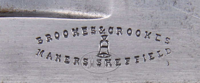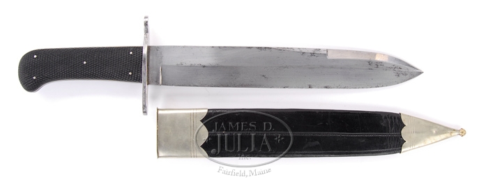 LARGE HEAVY BROOKES & CROOKES SPEAR POINT BOWIE KNIFE. Wonderful heavy Bowie with 12″ spear point blade that has a 4-1/2″ false edge and is 17-1/4″ overall length. It is 1-5/8″ at the ricasso and 1/4″ thick at the handguard with a slightly tapered tang. Left ricasso is marked “BROOKES & CROOKES / MAKERS, SHEFFIELD” in a double arc with the company bell trademark in the center. The steel handguard is about 5/32″ thick x 4″ long with J-shaped flat quillions. The handle is slightly tapered with a rounded birdhead pommel with checkered ebony scales that have brass liners and are secured with five German silver pins. Accompanied by its orig black leather sheath with German silver throat & tip that have scalloped edges. The tip has a small ribbed gold ball finial and the throat has a thin flare at the top. Back side has a sewn & riveted belt loop with buttonhole. CONDITION: Very fine plus. Blade remains full length with some orig polish having been lightly cleaned with some fine surface discoloration and pin prick pitting in scattered spots, mostly on left side. Handle is completely sound with sharp checkering and only a couple of chipped diamonds. Sheath is strong & bright with some slight deterioration by the edge of the tip and retains most of its orig black finish. Throat & tip are fine. A wonderful Klondike Gold Rush era Bowie that has remained in near new condition. 4-31666 JR426 (3,000-5,000)