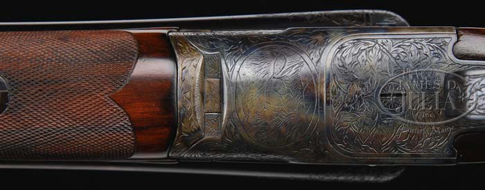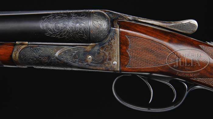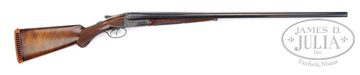 *OUTSTANDING RESTORED A. H. FOX XE GRADE SIDE-BY-SIDE SHOTGUN. SN 30010. Cal. 12 ga. 30″ Chromox Fluid Steel bbls with tapered, matted, concave rib with dual ivory sighting beads, 2-3/4″ chambers, FULL / FULL chokes, dbl triggers & ejectors. Chamber areas have 1-1/2″ wedge of leaf-and-vine engraving. Right bbl marked “CHROMOX FLUID COMPRESSED STEEL” & left “Made By A. H. Fox Gun Co. Phila. PA. U.S.A.”. Rebated X grade receiver engraved with leaf-and-vine pattern with shaded background, an oval with 2 flying ducks & “Ansley H. Fox” on left side & an oval with 2 flying quail and “Ansley H. Fox” on right side. Vignette on bottom is an oval with a fox looking up & hills in background. Remainder of action is leaf-and-vine with shaded background. Mounted with very colorful “streaky” walnut with checkered side panels, checkered rounded pistol grip & Hawkins pad. Checkered splinter forend with Schnable ebony insert tip. Bore diameter: left -.729, right -.728. Bore restrictions: left -.037, right -.037. Wall thickness: left -.032, right -.031. Drop at heel: 2-3/8″, drop at comb: 1-3/4″. Weight: 7 lbs. 13 oz. LOP 14-1/2″. PROVENANCE: The David Herrmann Collection. CONDITION: Extremely fine, as restored. This has an extremely high quality restored finish and could pass for orig. Blue & case colors are near 100%. Trigger guard with gold initials “E.D.” has near all of its finish. Stock is sound with 2 very minor hairline cracks behind top tang & slight chip on bottom left at rebate. There is a filled knot on top rear of comb & left side bottom toe line. Finish is a smooth hand-rub oil with fine fully-pointed checkering. Forend is solid with minor dark area around iron with hand-rubbed oil finish, fine checkering & Schnable ebony insert tip. Gun is tight, mechanics are crisp, with strong ejectors & shiny bores. 4-35246 BDT27 (7,000-10,000)