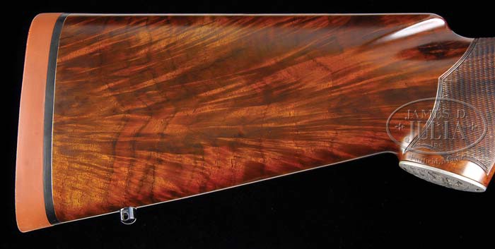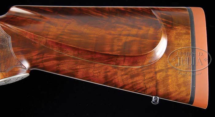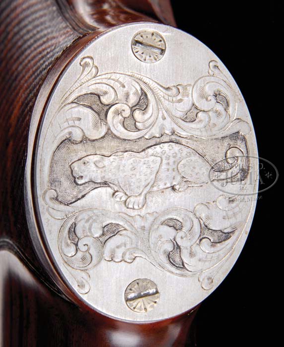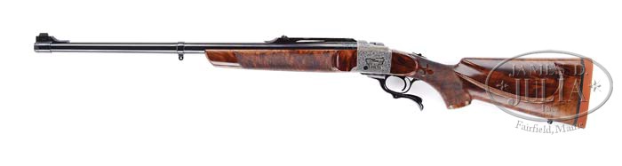 *INTERESTING CUSTOM RUGER 1 SINGLE SHOT RIFLE. SN 6822. Cal. 375 H&H. 24″ bbl, banded front ramp with gold bead sight, bbl band swivel, Ruger 1/4 rib with flip-up rear sight. Muzzle has wide band of scroll engraving with accenting scroll on each side of ramp and directly behind. Chamber has matching wide band of scroll as well as an 1-1/2″ wedge of scroll engraving on each side of quarter rib and caliber marking on left side. Top of bbl is marked “STURM, RUGER & CO. INC., SOUTHPORT, CONN. U.S.A”. The falling block action is beautifully engraved with relief bold foliate scroll, and in relief engraved majestic male lion on left side, matching scroll and Kudu bull on right side, scroll over top of action, and center of bottom. The right side is stamped “KAYE” identifying this work by noted engraver “T.J. KAYE”. Mounted with highly figured walnut, raised side panels, fleur-de-lis checkered pistol grip, relief engraved pistol grip cap of a crouching leopard, straight comb, solid red Old English recoil pad, left side cheekpiece, and sling swivel stud. Beavertail forend, fleur-de-lis checkered with hole for attaching screw filled with ebony and checkered to match. This fine stock work was executed by “Red Jackson”. This gun is pictured in Joe Clayton’s book “Ruger No. 1”, color Plate I, with a matching 458. This fine custom work was executed on a very early 4-digit No. 1 action. CONDITION: Extremely fine, gun appears new since completion. Bbl retains virtually all of its fine custom blue. Receiver retains all of its fine grayed custom finish. Stock is sound with sharp checkering, a couple minor handling marks and retains all of its fine custom oil finish. Forend is sound with sharp checkering, a few minor handling marks, and retains virtually all of its fine custom oiled finish. Mechanics are crisp with a nice shiny bore. 4-39706 BDT61 (4,500-7,500)