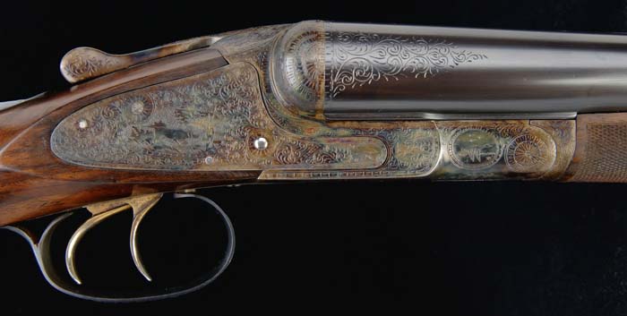 RARE L.C. SMITH MONOGRAM GRADE DOUBLE BARREL SHOTGUN. Cal. 10 ga. SN 2602. Beautiful high grade big bore with 32” Sir Joseph Whitworth Steel bbls with tapered, concave, matted rib, sgl bead, crossbolt rib extension, extractor and gold plated dbl triggers. Mounted with replacement, nicely figured, English walnut with fleur-de-lis carved & checkered, dbl black insert, splinter forearm & semi-pistol grip stock, 14-1/8” over an old Noshoc solid red pad. Receiver & lockplates are engraved in typical Monogram patterns with bird dogs on each lockplate and maker’s name in a ribbon on each side. There is a small vignette of a flying duck on the left front side of receiver and of a flying goose on right front side of receiver with the balance having about 75% coverage floral & arabesque patterns. Forend iron, rib extension, about 2” over chamber areas and about 1” at muzzles are engraved to match. This appears to be an upgraded gun with the serial number having been stamped over an existing number. The previous number appears to have been “2062”. There is a letter “M” stamped on left side of frame, underneath lockplate. Bore diameter: left – .785, right – .783. Bore restrictions: left – .060, right – .059. Wall thickness: left – .035, right – .032. Drop at heel: 2-3/4”, drop at comb: 1-5/8”. Weight: 9 lbs. 1.6 oz. Accompanied by a Cody Firearms Museum letter identifying this shotgun with two entries, first as a Grade 1E and then as a Monogram Grade. Both entries reflect 10 ga. with 32” Damascus bbls. The first entry gives the stock dimensions as 14-1/2” pull with 1-7/8” drop at comb and 3-3/16” drop at heel. It was shipped Sept. 7, 1897 to A.C. Chase, tagged Thomas Hughlett. CONDITION: Very fine, as completely restored. Bbls retain bright rust blue and receiver & lockplates brilliant, orig style, case colors. There is a hairline back of right lockplate, otherwise wood is sound and retains virtually all of its bright custom finish. Mechanics are fine, bright shiny bores that have been honed. 4-30180 JR174 (5,000-10,000)