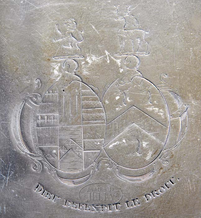 SMALL STERLING ENGLISH 18TH CENTURY SALVER BY JOHN CARTER. Shaped edge plate having interspersed five lobe shells on C and S-scrolls. Hallmarks are clear and the plate rests on three small scrolled feet. Center having a family crest with Latin phrase “Dieu Defendit Le Droit”. WEIGHT: 8 tr. oz. SIZE: 1″ h x 7″ dia. CONDITION: Very good. 9-91993 (250-400)