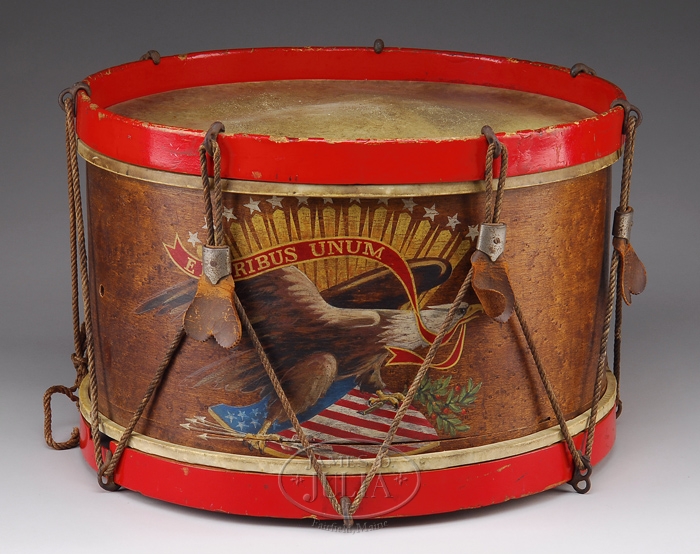 MAINE-MADE CIVIL WAR ERA DRUM. This eagle-and-shield hand decorated drum is labeled on the interior “John D. McCarthy Drums…Lewiston Maine”. The fierce eagle decoration with “E Pluribus Unum” banner in beak, peace branch and arrows in its talons, all on a red, white, and blue shield. Thirteen gold rays and stars are arrayed over the wings. All but one of the original tighteners are present, skin on the top appears original, the bottom one an old replacement. CONDITION: Drum side has a split radiating the entire circumference of the drum, painted eagle is strong, two retaining bands on top and bottom appear to be repainted. 4-32242 JJ15 (5,000-8,000)