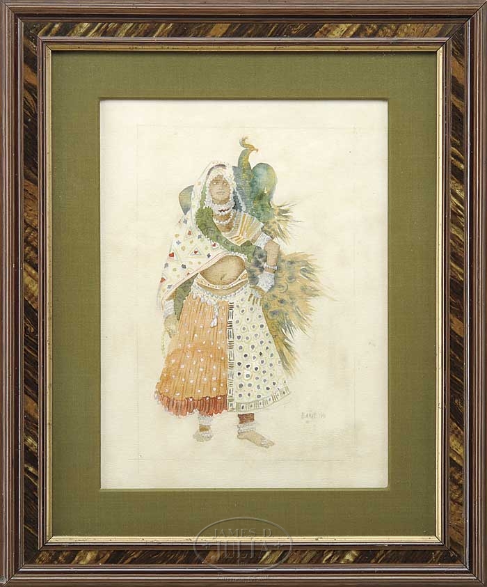 LEON SAMOILOVITCH (LEV) BAKST (Russian, 1866-1924) COSTUME SKETCH OF “BAYARERE WITH PEACOCK” FROM THE BALLET LE DIEU BLEU. Watercolor costume design shows a woman in a fancy skirt with open shawl top having a wrap around peacock shoulder sash. Signed lower right “Bakst 1911″. Housed in a modern decorative frame with green linen matte. SIZE: Sight: 15-1/4″ x 11-1/4″. Within pencil border: 13″ x 8-1/2”. CONDITION: Very good. 9-20425 (10,000-15,000)