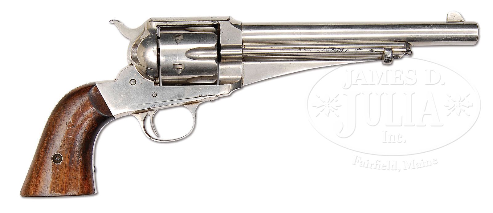 REMINGTON MODEL 1875 SINGLE ACTION ARMY REVOLVER. SN 746. Cal. 44 WCF (44-40). Nickel finish with 7-1/2″ bbl, full front sight and “E.REMINGTON & SONS, ILION, N.Y. U.S.A.” address. Top left side of frame is stamped “44”, which indicates the 44 WCF caliber. Mounted with smooth 2-pc French walnut grips, matching numbered to this revolver. According to Flayderman’s Guide to Antique American Firearms, only 25,000 to 30,000 of these scarce revolvers were produced in the period 1875-1889. While the Remington was much more convenient and therefore quicker for dismounting the cylinder than the Colt Single Action Army revolver, they appeared on the market a couple of years after the Colt already had substantial military contracts and wide acceptance with the buying public. The Remington distribution system was never able to catch up and after a couple of additional improve models came out with equally poor success, Remington ceased production of this fine large bore revolver. CONDITION: Very fine, overall retains about 95% strong orig nickel with a minor loss on the bottom left front edge of frame with fine pitting and another spot on the top left front edge of frame. There are a couple of other small spots of flaking on the top strap and ejector rod. Grips are sound, showing light wear, and retain about 97-98% varnish on left side and 85% on right side. Hammer will not catch in the half cock notch, otherwise mechanics are fine, strong bore with moderate pitting. 4-47063 JR118 (6,000-8,000)