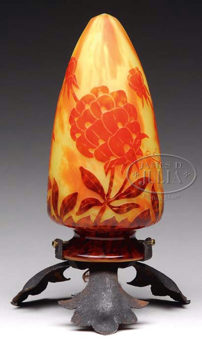 LE VERRE FRANCAIS VEILLEUSE. Veilleuse lamp is decorated with a “Pivoines” pattern in vibrant orange, in a tortoise shell hue. These colors are set against a vibrant orange and yellow ground. The shade is supported by a three-legged metal base with single socket. Shade is signed, “Charder” in cameo on the side, as well as “Le Verre Francais” to edge. SIZE: Shade 9″ t. CONDITION: Shade is in very good to excellent condition. Base is a high quality replacement. 5-69352 (1,750-2,250)