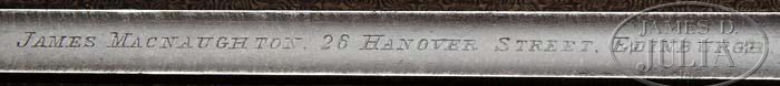 MACNAUGHTON ROUND ACTION BAR-IN-WOOD “THE EDINBURGH” LIGHT GAME GUN WITH ORIGINAL CASE. SN 788. Cal. 16 Ga. 2-1/2″ Chambers. 30″ Three Stripe Damascus barrels are engraved “James Macnaughton. 26 Hanover Street, Edinburgh” on concave game rib with third bite extension. Bbl flats show London black powder proofs for 16 ga. Bottoms of bbls are stamped “Macnaughton” and No. 788. Bar-in-wood “skeleton” trigger plate action has long cocking/ opening lever with crystal window underneath for viewing hammers. Safety is a toggle with “Safe” engraved in relief. Water table is stamped with “Macnaughton”, SN, “The Edinburgh”, “Macnaughton Patent” and “No. 28” (Patent use no.). Trigger plate has long tang through grip. Trigger guard bow is affixed to plate at front and back. Metal parts are engraved with Celtic rope-work borders on trigger guard bow and fences, with light vine borders elsewhere. Well cut scroll is in-fill. “Macnaughton” and “Edinburgh” are in ribands across fences. Dark, well streaked and slightly figured European walnut straight grip buttstock measures 14-1/4″ over original checkered horn buttplate, and features 16 LPI point pattern checkering with mullered borders. There is a vacant gold oval on toe line. Matching splinter forend has Deeley release. Bore diameter: left -.669, right -.667. Bore restrictions: left -.002, right -.001. Wall thickness: left -.020, right -.019. Drop at heel: 2-3/8″, drop at comb: 1-5/8″. Weight: 6 lbs. 1 oz, LOP 14-1/4″. Original makers oak and leather case has distinctive Edinburgh decoratively filed brass corners. Cover is embossed with “R. M. Turnbull” in center of cover surrounded by decorative lines and stampings. Interior is lined with light tan pigskin, with Macnaughton paper label, and contains 2-pc short handled mahogany cleaning rod, pair of ebony handled turn screws, and unmarked roll crimper. These accessories fit compartments fairly well, and may be original to gun. PROVENANCE: Letter from previous owner giving the history of original owner of this gun, R. M. Turnbull, and how it descended through his family. CONDITION: Fine. Bbls retain 70 – 80% original brown, silvered and worn in normal places. Action is mostly silver gray, with case hardening color evident in protected areas. Stocks appear to have what remains of their original finish, maintained over the years, and are quite pleasing. Checkering has been correctly re-cut. Action is tight. Bbls are on face. Bores are fair, with considerable areas of pitting, mostly toward breech. Case is very fine. Leather is still relatively light, but with areas of staining, marks and rubs. Straps and handle are replacements. Interior leather is good, again with large areas of staining, mostly in lid near breech of bbl recess. Some leather has been restored in bottom, and lids replaced on some compartments. Accessories are good. A fine example of this scarce and highly sought after gun, and very unusual to be found in this gauge, with original casing, and its family history. 4-40615 MGM58 (15,000-20,000)