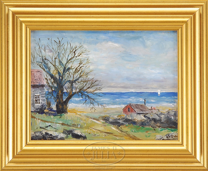 SIGNED (20th Century) SEASIDE HOME. Oil on masonite coastal scene shows a house with large tree with fishing shack. A sailboat is seen on blue ocean under colorful sky. Signed lower right indistinctly. Housed in a modern gilt frame. SIZE: 6″ x 8″. CONDITION: Very good. 9-96903 (100-200)
