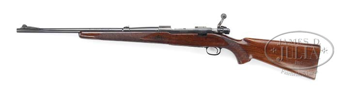 *WINCHESTER PRE-WAR MODEL 70 CARBINE. SN 42004. Cal. 7 MM (7×57). 20″ bbl with stippled integral ramp with Lyman ivory bead front sight and Lyman 2-leaf flip rear. Left side of bbl is marked “WINCHESTER / PROOF STEEL – MODEL 70 – WINCHESTER / TRADEMARK – 7 M/M”, right side “MADE IN U.S.A. WINCHESTER REPEATING ARMS CO. / NEW HAVEN. CONN. – PATENTED”. Bottom of bbl “7 M/M” with a triangular proof and dated “38”. Standard pre-war receiver with “WINCHESTER / TRADEMARK” center left side, SN forward right side, cloverleaf tang, clip slot rear bridge with matted top that has been slightly lowered and drilled and tapped. Solid handle bolt with proper matching SN, “A” marked extractor and 3rd style bolt shroud and safety. Mounted with straight grain pre-war low comb stock, front swivel has been cut flush with stock, checkered side panels, notched for 48 WJS sight, checkered pistol grip, checkered steel buttplate with 43 notches around outside edge, steel floorplate and trigger guard. Standard follower with spring stamped “1”. CONDITION: Very good, bbl retains 80% orig rust blue that is thinning and blending with a brown patina, typical nicks, dings and scratches. Receiver retains a matte gray finish with wear on sharp edges. Bolt handle has been slightly modified to clear scope and 3rd style safety. Stock is sound with good checkering, numerous nicks and dings and hunting marks with an area on left side behind forearm checkering with a series of shallow depressions, retains orig finish blending with hand worn patina. Rear sling swivel hole has been neatly filled with a screw that fits flush and blends with stock. Floorplate retains most of a high polish restored blue finish. Trigger guard retains 70-80% thinning orig blue with wear on sharp edges and front of loop. Mechanics are crisp with shiny bore with dark grooves. 4-38816 BDT109 (2,000-3,000)