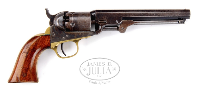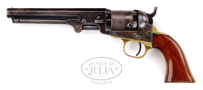 COLT MODEL 1849 POCKET REVOLVER. SN 322587. Cal. 31. Usual configuration with 6″ oct bbl, brass pin front sight and 1-line New York U.S. America address. It has 5-shot cylinder with “COLT’S PATENT” on left side of frame & brass grip frame with 1-pc walnut grip. CONDITION: Fine, all matching except rammer which is properly unnumbered. Bbl retains 60-70% thin orig blue, strong on bottom three flats with some fine pitting around muzzle. Rammer retains faded case colors on pivot. Cylinder retains traces of orig blue with about 75-80% stagecoach holdup scene with some fine pitting around front edge. Frame retains 75-80% orig case colors, bright on right side, a little more faded on left side and on recoil shields. Hammer retains strong case colors on sides & back edge. Trigger guard & backstrap are a mellow brass patina. Grip has a couple of dings on left bottom edge and another on right and retains 80-85% orig varnish. Mechanics are fine, strong bright bore with scattered fine pitting. 4-59729 JR409 (2,500-3,500)