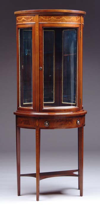 FINE INLAID MAHOGANY REPRODUCTION CURIO CABINET. Rounded front cabinet has single bow-front door and curved side glass, two adjustable glass shelves and mirror back. One drawer. All resting on four tapered square legs and shaped shelf below. Nice inlay of bellflower and bellflower swags with patera inlays, decorative china and brass pulls. Key present. Mid-20th Century. SIZE: 60-1/2” h x 24” w x 13” d. CONDITION: Very good to excellent. 9-72134 (500-800)