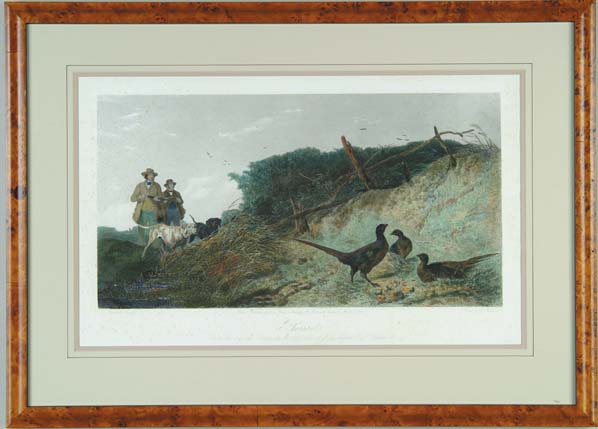 OWEN BAILEY (Publisher, British, 19th Century) “PHEASANT”. Dated March 1st, 1852. Richard Ansdell and David George Thompson. Colored engraving shows hunting dogs pointing at group of pheasants with oncoming hunters. Housed in a birdseye maple reproduction frame with double matte. IMAGE SIZE: 11-3/4” x 22-1/4”. CONDITION: All over light foxing, otherwise very good. 9-95421 (300-500)