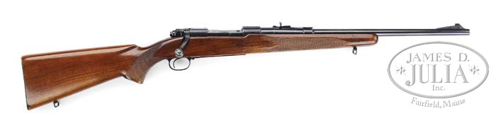 *WINCHESTER TRANSITION MODEL 70 CARBINE. SN 78831. Cal. 22 Hornet. 20″ bbl with integral stippled front ramp with fine bead sight and 22 rear sight. Left side bbl marked “WINCHESTER / PROOF STEEL – MODEL 70 – WINCHESTER / TRADEMARK – 22 HORNET”. Right side of bbl “MAKE IN U.S.A. WINCHESTER REPEATING ARMS CO. / NEW HAVEN. CONN. – PATENTED”. Winchester proof marks can be found at stock line, left side of bbl and adjacent receiver. Transition model receiver with “WINCHESTER / TRADEMARK” on center of left side, SN forward right side, cloverleaf tang with smooth rear bridge factory drilled and tapped. Bolt with solid bolt handle and type “2” safety. Steel floorplate and trigger guard with “H” stamped near hinge on floorplate. Mounted with standard low comb transition stock, factory sling swivel in forend, checkered side panels, checkered pistol grip, steel checkered buttplate and factory sling swivel. Bottom of bbl is stamped “22 H” and dated “38”. Proper 22 Hornet mag box, spring and follower. Proper Hornet bolt, extractor and matching SN. CONDITION: Very good to fine, bbl retains 90-95% orig blue with minor muzzle wear, some minor nicks and scratches, a faint rub line on both sides of bbl about 1-1/4″ from receiver. Receiver retains 95% of factory dull blue finish. Bolt handle is starting to thin across knob. Floorplate and trigger guard retain 95% factory blue with some light scratching and bright on sharp edges. Stock is sound with good checkering, numerous nicks and dings, top of stock at peep sight area on left has a very shallow notch and dimple, some flaking of finish in front of sling swivel and across bottom of stock and retains a thin coat of added finish with hand worn patina in grip area. Mechanics are crisp with nice bright bore. 4-38818 BDT105 (3,000-5,000)