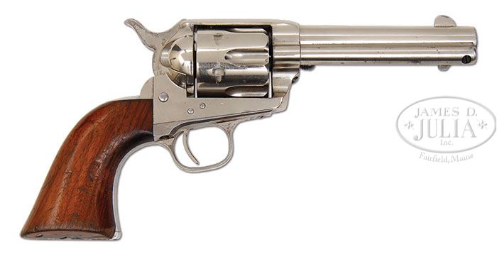 COLT SINGLE ACTION ARMY REVOLVER. SN 112464. Cal. 45 Colt. Nickel finish with 4-3/4″ bbl, full front sight and 2-line address. Left side of frame has 3-line patent dates and left front web of trigger guard has the caliber marking. Accompanied by a Colt factory letter which identifies this revolver in caliber 45 Colt with 4-3/4″ bbl, nickel finish, type of stocks not listed and shipped to W.R. Burkhard, St. Paul, MN on Sept. 4, 1885 in a 3-gun shipment. CONDITION: Very fine. Overall retains about 95-96% strong orig nickel with some minor losses around forcing cone and fine roughness on left side of frame; front strap & backstrap are lightly dulled; cyl retains about all of its orig nickel on outer diameter & rear face with the front face a gray metal color. Grip has a chipped & repaired right toe with a few hammer marks on bottom edges, showing moderate edge wear with light nicks & dings and retains 93-95% strong orig varnish. Hammer is not solid in safety notch, otherwise mechanics are fine, strong frosty bore. 4-46570 JR215 (8,000-12,000)