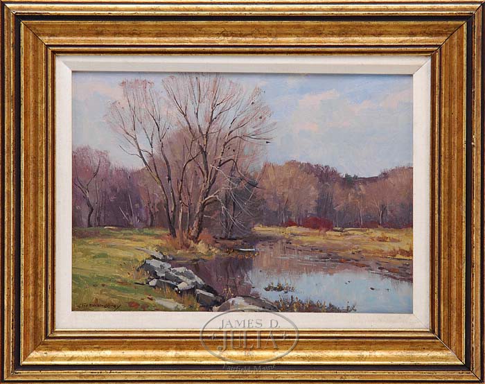 BERNARD COREY (American, 1914-2000) “QUIET PLACE”. Oil on masonite late fall scene shows a stream with rock and tree banks curving through field leading to dense woods. All under light blue and white cloud sky. Signed lower left, titled and signed on reverse. Housed in a fine gilt molded wood frame with linen liner. SIZE: 10″ x 14″. CONDITION: Very good. 9-94078 (1,200-1,800)