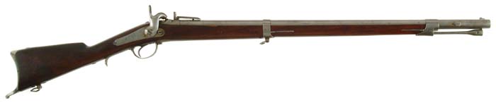 CHATELLERAULT RAMPART RIFLE. Cal. 83 rifled. NSN. 34-1/8” octagonal bbl. This rifle was made on the “a Tige” system which involved smashing a rnd ball flat on the anvil in the chamber to fill the rifling. Despite the single leaf sight graduated to 1,000 meters, this was not considered an accurate rifle. It is dated 1841 on right quarter flat of bbl. Most of the parts have inspector marks including the screw heads. CONDITION: Metal has been cleaned bright, and stock lightly cleaned with minor handling marks remaining. Mechanically fine. 4-40593 FS29 (1,000-1,500)