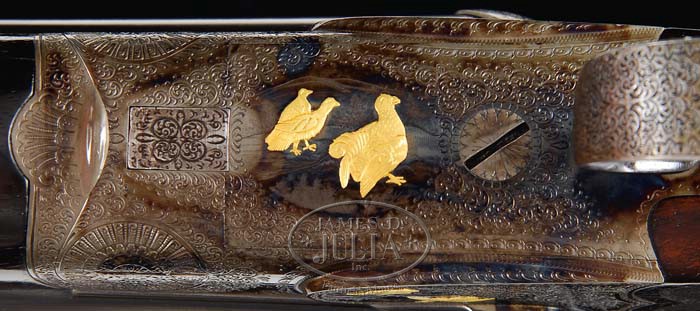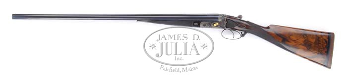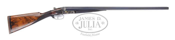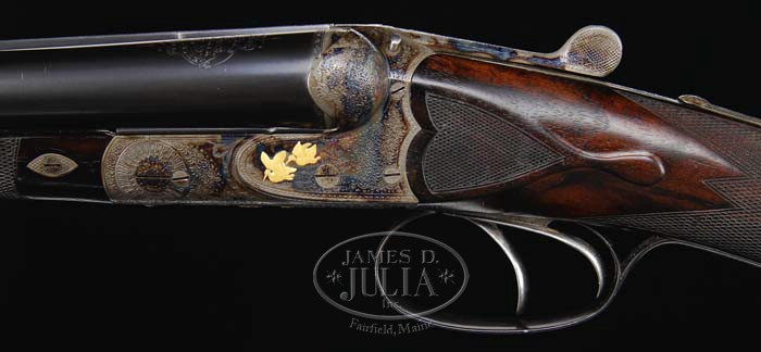 CHARLES DALY DIAMOND QUALITY LIGHT WEIGHT EJECTOR GUN BY H. A. LINDNER WITH CASE. SN 1290. Cal. 12ga. 2-3/4″ Chambers. Double triggers. Automatic safety. 28″ Dovetailed bbls have “Witten Excelsior Steel” in trademarks on top of each bbl. “Charles Daly Diamond Quality” is engraved on nicely matted concave game rib w/ square cross bolt extension. Number “2” is engraved in oval toward breech. Bbl flats have German black powder proofs. Bottoms of bbl are stamped “Excelsior Witten” w/ other German proofs, and Lindner crossed pistols surmounted by HAL logo. Number “1474” is on right bbl. Charles Daly number “1290” is on the flats. Scalloped back box lock action has dual locking lugs, square cross bolt top fastener, side clips, intercepting sear safeties, and pin cocking indicators. Action is nicely engraved w/ fine closed scroll, w/ raised gold inlays of game birds, including a pair of diving snipe on the left side, a trio of ducks on the right, and a trio of auerhann, one male and 2 females on the bottom. Number “2” engraved on top lever. Trigger guard is scroll engraved w/ hunting dog, and Daly SN on grip. Nicely marbled European walnut straight grip buttstock measures 13-3/4″ over brown “Old English” pad w/ quarter inch spacer, featuring vacant gold oval, elongated drop points, checkered side panels, and 22 LPI checkering w/ double line border. Splinter forend has a Deeley release w/ horn tip, and heavy mullered border around release w/ checkering to match buttstock. Bore diameter: left -.721, right -.720. Bore restrictions: left -.017, right -000. Wall thickness: left -.026, right -.022. Drop at heel: 2-3/8″, drop at comb: 1-1/2″. Weight: 6 lbs 3oz. Heavy tan canvas Brady CASE has stitched leather corners, w/ maroon cloth interior w/ reproduction Daly label, Brady label, and includes snap caps, and oil bottle. PROVENANCE: Dr. Frank Miller Collection. CONDITION: Fine, as refinished. Bbls retain 98% fine quality re-black. Engraving is all sharp. Action retains nearly all well done re-case color. Trigger guard is mostly gray brown. Buttstock retains most of older oil refinish w/ few marks and compressions from use. Checkering has been re-cut. Forend is missing a small sliver of wood on right side near iron. Action is slightly loose and off face. Ejectors are in time. CASE and accessories are very fine. Daly label shows some staining. Straps show some use. 4-35648 MGM95 (7,000-10,000)