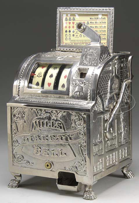 MILLS CAST IRON “LIBERTY BELL” SLOT MACHINE. A number of years ago a fellow out of Canada recreated the three classic fancy iron Mills three reels machines…the Liberty Bell, the Operator’s Bell & Liberty Bell-Gum-Fruit. This particular example has one of these iron cabinets and an original Mills mechanism is utilized inside. The reel strips are the earlier more desirable style of kings, queens, spades and hearts. Machine is in functional working order. Castings on the side are a city view of New York with the Statue of Liberty in the foreground. Front and rear castings are also quite fancy and the machine overall has great presence. SIZE: 14″ x 14″ x 22″ h. CONDITION: Overall very good and mechanically functioning. 1-11207 (2,500-3,500) Auction: Advertising, Toy & Doll - Fall 2011 Please Note: All prices include the hammer price plus the buyer’s premium, which is paid by the buyer as part of the purchase price. The prices noted here after the auction are considered unofficial and do not become official until after the 46th day. |