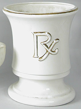 STORE DISPLAY CERAMIC MORTAR. Oversized pharmacist’s gilt and white glazed mortar. Bottom not marked but probably manufactured by Gilman Bros., Boston, Massachusetts. SIZE: 12″ d x 15″ t. CONDITION: 3-1/2″ hairline extending down from top rim; loss of gilt to relief “Rx”, otherwise good condition. 1-26967 (200-300) Auction: Advertising, Toy & Doll - Fall 2001 Please Note: All prices include the hammer price plus the buyer’s premium, which is paid by the buyer as part of the purchase price. The prices noted here after the auction are considered unofficial and do not become official until after the 46th day. |