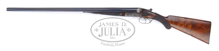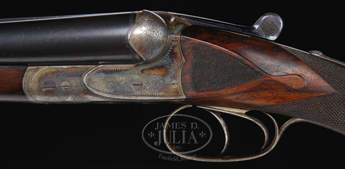 *CHARLES DALY LIGHT WEIGHT BOX LOCK EJECTOR BY H. A. LINDNER. SN 1646. Cal. 12ga. Double triggers. 2-5/8″ Chambers. 28″ Dovetailed steel bbls are engraved “Charles Daly Krupp Fluid Steel Barrels” on machine matted concave rib w/ square cross bolt extension. Bbl flats have German black powder proofs and SN “1646”. Bottom of bbls are stamped “S” in numerous places, w/ crossed pistols surmounted by initials “HAL” as logo for Lindner. Right bbl has number “1892.” Scalloped back box lock action has dual under lugs, square cross bolt, side clips, intercepting sears, and pin cocking indicators w/ 50% coverage of Germanic scroll w/ “Charles Daly” engraved on both sides. “Safe” is inlaid in gold on top tang in front of safety button. Trigger guard has some scroll w/ SN on grip. Nicely streaked and figured semi pistol grip European walnut buttstock measures 14-1/8″ over a horn butt plate w/ ribbed central panel, featuring vacant German silver oval, elongated drop points, and 20 LPI checkering w/ double line border and checkered side panels. Splinter forend has a Deeley release w/ horn tip, and checkering to match buttstock. Bore diameter: left -.727, right -.729. Bore restrictions: left -.028, right -.012. Wall thickness: left -.021, right -.020. Drop at heel: 2-7/8″, drop at comb: 1-5/8″. Weight: 6 lbs 3oz. CONDITION: Very fine. Bbls retain 95% orig blue, and have original damascene marks still visible on breech ends and ejectors. Action retains 80-90% orig case color, thinning behind forend, action beads and fences. Top lever retains nearly all its orig blue, silvering at top of thumb piece. Stocks retain most of orig oil finish, w/ nicks and few gouges, one fairly large on left side near oval. Horn butt plate and forend tip show considerable moth damage. Action is tight. Bbls are on face. Bores are excellent w/ no visible flaws. Action is gummed up w/ old grease and oil, and badly in need of cleaning, as right bbl won’t fire at this time. Screw slots are very good w/ some evidence of use. This gun has been put away for a long time. 4-35822 MGM87 (4,000-6,000)