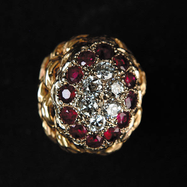 DIAMOND AND RUBY 18KT GOLD RING. Set with twelve genuine rubies, approximately 2.75ct. Also six genuine diamonds approximately 1.33ct total weight. Color of diamonds are approximately G to I with VS1 clarity. CONDITION: Very good. 3-30363 (800-1,200)