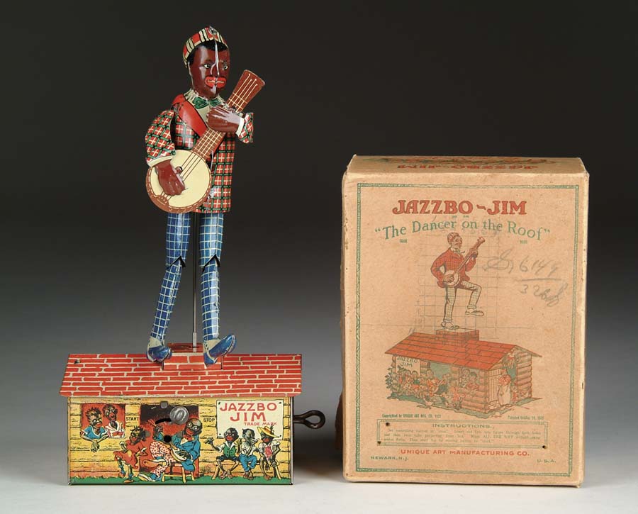MARX JAZZBO JIM TIN WIND-UP IN O/B. U.S.A. Black banjo player does “The Jig” on rooftop. Cabin below shows lithographed depictions of black mammy, pickaninny kids, and other stereotypical black characters. Original box reads, “WATCH DEM KIDDIES SMILE!” SIZE: 10” t. CONDITION: Best example we have carried. Toy and box are all-original and near excellent. WP 1-3761 (900-1,200) Auction: Advertising, Toy & Doll - Spring 2005 Please Note: All prices include the hammer price plus the buyer’s premium, which is paid by the buyer as part of the purchase price. The prices noted here after the auction are considered unofficial and do not become official until after the 46th day. |