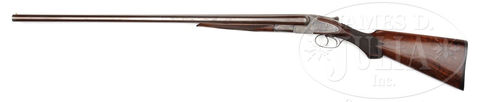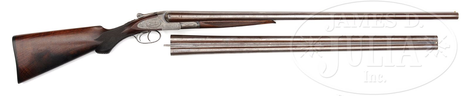 FINE L.C. SMITH QUALITY 3 TWO BARREL SET. SN 37317. (ca 1894) Cal. 12 ga. 2-3/4″ Chambers. 28″ and 30″ Damascus bbls, both with slightly raised, concave, matted ribs, mounted with two ivory beads, and engraved “HUNTER ARMS CO. MAKERS FULTON N.Y.” on unmatted portions at rears. Both bbl flats are stamped with matching SNs. Bottoms of bbls are stamped with Birmingham provisional proofs and “D”, which is mostly polished out. Splinters are stamped “3”. Loop of 30″ bbls is stamped “2”. Case hardened action is stamped with SN and patent dates on water table, and is engraved in early no. “3” style, with flourishes of scroll in geometric and line borders. Lockplates have scroll surrounding oval vignettes of game birds; a pair of snipe on left, and quail on right, and are marked “L. C. Smith” on bottoms. Trigger guard has matching scroll on bow. SN on tang, extends to double dimpled composition grip cap. Lightly figured European walnut capped semi pistol grip buttstock measures 14-1/16″ over orig buttplate embossed with coarse and fine checkering, and hunting dog scene at center. Checkering at grip is of multi-point pattern with flourishes at rear. Each bbl is equipped with its own matching splinter forend, which have inset ebony tips and circular central medallions with dogs head. There is no way to differentiate which forend fits with which set of bbls except by trial and error. (The forend with the most wear and short iron fits the 28″ bbls.) 28″ Bbls: Bore diameter: left-.724, right -.724. Bore restrictions: left -.029 (Full), right -.004 (IC). Wall thickness: left -.032, right -.020. Drop at heel: 2-13/16″, drop at comb: 1-5/8″. Weight: 7 lbs. 3 oz. LOP: 14-1/16″. 30″ Bbls: Bore diameter: left-.728, right -.725. Bore restrictions: left -.038 (Extra full), right -.033 (Full). Wall thickness: left -.029, right -.027. Drop at heel: 2-5/8″, drop at comb: 1-9/16″. Weight: 7 lbs. 4 oz. LOP: 14-1/16″. Also included is a green canvas covered period case with leather trim and nickel-plated latch, which has plaque on top marked “Delphi Ind”. Case is lined in olive green cloth. CONDITION: Fine. 28″ Bbls retain most of their orig brown finish, considerably thinned and lightened toward breech ends from normal hand wear. 30″ Bbls retain 70 – 80% of their rich brown with some spots, silvering at muzzles, thinning above forend. Action and lockplates retain most of their case hardening color, vivid where protected, with considerable fine spotting on lockplates. Bottom of action is silvered and gray brown. Stock retains most of its orig oil finish with a number of minor and deeper scratches and marks, grain slightly raised. Approx 10″ square area on bottom right of butt shows some scorching. Bores are excellent. Left bbl of 30″ bbls has a long striation and chambers show reamer chatter. Action is tight. Bbls are on face. Case is fair, soiled and with edges worn through. Straps and handle are missing. Interior cloth is fair. 4-49297 MGM223 (4,000-6,000)