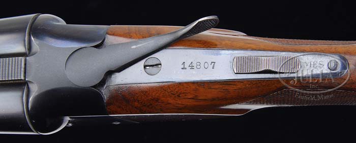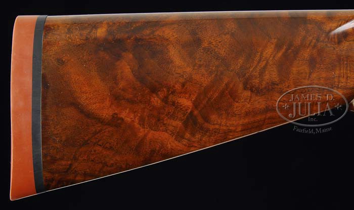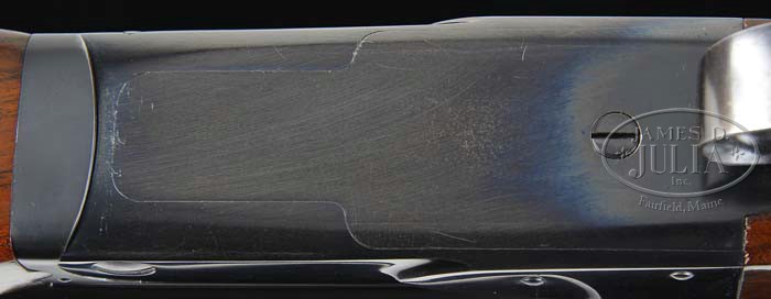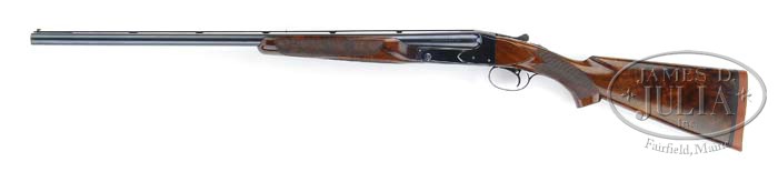 *RARE WINCHESTER MODEL 21 STANDARD GRADE WITH VENT RIB. SN 14807. Cal. 16 ga. 26″ bbls, tapered matted factory vent rib, red Bradly front and silver center sighting bead, 2-3/4″ chambers, choke marked “WS1 & WS2”, ejectors, and single selective trigger. Side of left bbl at chamber is marked “WINCHESTER-16GA/2-3/4CHAM.” Usual step side receiver mounted with very nicely figured walnut, checkered beavertail forend, checkered pistol grip and Winchester solid red recoil pad. Bore diameter: left -.664, right -.664. Bore restrictions: left -.005, right -(.018). Wall thickness: left -.029, right -.024. Drop at heel: 2-1/2″, drop at comb: 1-5/8″. Weight: 7lbs. 4oz. LOP 14″. CONDITION: Extremely fine. Bbls retain 97-98% orig blue with some very faint muzzle wear, a few tiny handling marks, and faint rub on bottom from forend. Receiver retains 95% orig blue, some faint sharp edgewear, some minor thinning on trigger palate blending with brown patina. Top center and top of opening lever area a fine orig matte finish. Stock is sound with good checkering, some minor faint handling marks and a few tiny scratches, retaining most of its orig finish with some slight hand worn patina in grip area. Forend is sound with good checkering, some minor nicks & scrapes & retains most of its orig finish. Mechanics are crisp, non-auto safety, strong ejectors and nice shiny bores. 4-37454 BDT149 (7,500-9,500)