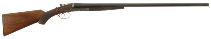 *SCARCE L.C. SMITH TRAP GRADE WILD FOWL DOUBLE BARREL SHOTGUN. Cal. 12 ga. SN RE98405. Beautiful long range duck gun with 3” chambers and so marked on bbl flats. It has 30” Crown Steel bbls choked FULL/MOD with concave, tapered, matted rib, sgl bead, crossbolt rib extension, ejectors & dbl triggers. Bottom of bbl lug is engraved “WILD FOWL”. Mounted with beautiful, slab sawed, highly figured, checkered American walnut with black insert, splinter forearm and pistol grip stock, 14-1/2” over a serrated, hard rubber buttplate. Lockplates are engraved in typical trap grade patterns with five trap shooters on left side and a live pigeon shooter on right side with maker’s name on each lockplate and with light arabesque patterns. Top lever & triggerguard are engraved to match as is the forend iron. Bore diameter: left – .728, right – .728. Bore restrictions: left – .042, right – .021. Wall thickness: left – .023, right – .026. Drop at heel: 2-3/8”, drop at comb: 1-3/8”. Weight: 7 lbs. 13.12 oz. Accompanied by a Cody Firearms Museum letter identifying this shotgun as a Trap grade, 12 ga. with 30” bbls, regular frame & ejectors finished Dec. 5, 1927 and shipped July 25, 1928 to Von Lengerke & Antoine. CONDITION: Very fine. Bbls retain 96-97% strong, restored rust blue with slight muzzle edge wear. Receiver & lockplates retain most of their orig case colors, strong & bright on lockplates, somewhat faded over top of receiver, turning silver on bottom front. Triggerguard retains most of its restored blue. Wood is sound and retains about all of an exceptionally fine, professionally restored finish. Mechanics are fine, bright shiny bores. 4-30200 JR176 (2,000-3,500)