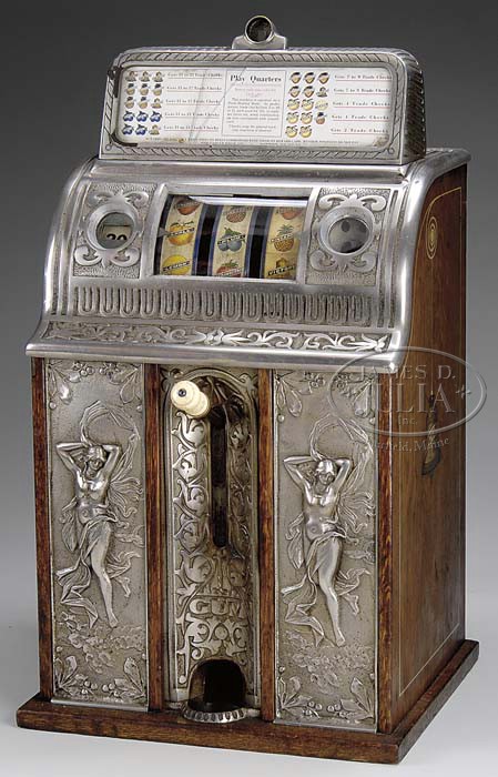ALL ORIGINAL CAILLE CAST IRON TWIN NUDE CENTER PULL SLOT MACHINE. A very desirable machine produced in cast iron or in aluminum and either with twin naked ladies or as a two column vendor. This particular example is of early manufacture with iron castings and the highly desirable apple, plum, pineapple, etc. reel strips. In untouched, as found all original condition, this machine resided in a private residence for over 40 years. It was passed on to the gentleman’s son who had no interest in keeping the piece. The wooden cabinet is of quartersawn oak with pinstriping on either side and the typical Caille victory bell decal located on the center wood panel of each side. Wooden paneled back door is intact. However, at some point it was pried open and a small sliver of wood as well as the lock are not present. Machine retains its original award card, reel strips, and a significant amount of nickel plating to the iron castings. Machine would benefit greatly from a good cleaning to not only the wood, but the castings as well. Mechanics are in functional condition and left window indicates the winnings from 2 to 20 coins (lacking rod). Small circular right window shows last coin played. A true rarity to find such a machine in untouched condition and fresh to the market! SIZE: 15″ w x 13″ l x 25″ h. CONDITION: Lacking cash box. Iron casting behind coin head has minor damage/loss to lower right and left corners. Knob on front of machine replaced. 1-11538 (10,000-15,000) Auction: Advertising, Toy & Doll - Fall 2011 Please Note: All prices include the hammer price plus the buyer’s premium, which is paid by the buyer as part of the purchase price. The prices noted here after the auction are considered unofficial and do not become official until after the 46th day. |