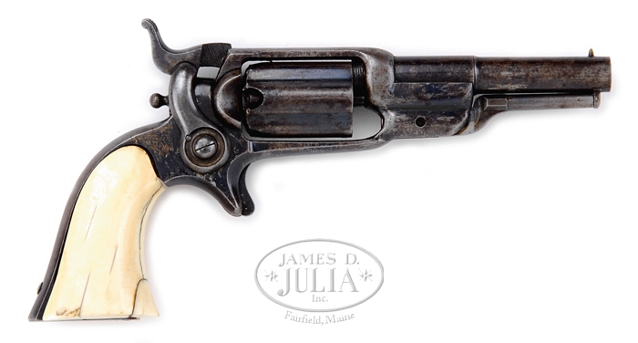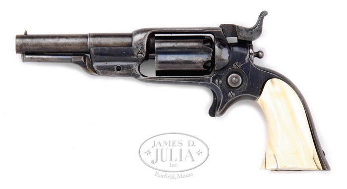 COLT 1855 MODEL 5 ROOT SIDEHAMMER PERCUSSION REVOLVER. SN 3090. Cal. 31. Blue finish with 3-1/2” rnd bbl, pin front sight with New York address. It has a 5-shot fluted cylinder with 1-pc ivory grip. CONDITION: Very good to fine, all matching. Bbl retains 25-30% flaked orig blue with balance flaked to a medium patina with wrench marks about center point. Frame retains about 60% orig blue, glossy & strong in sheltered areas, flaked & worn to a medium patina elsewhere. Cylinder retains about 50% orig blue, mostly in flutes. Grip has a repaired chip in toe, exhibits shrinking with several age lines and retains a light mellow patina. Mechanics are fine, strong bore with light to moderate pitting. 4-59623 WD453 (500-1,000)
